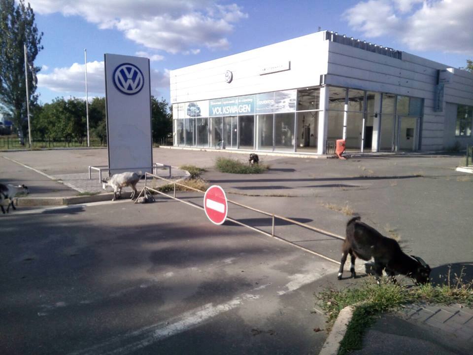 Луганськ сьогодні. Кози замість машин в автосалоні Volkswagen