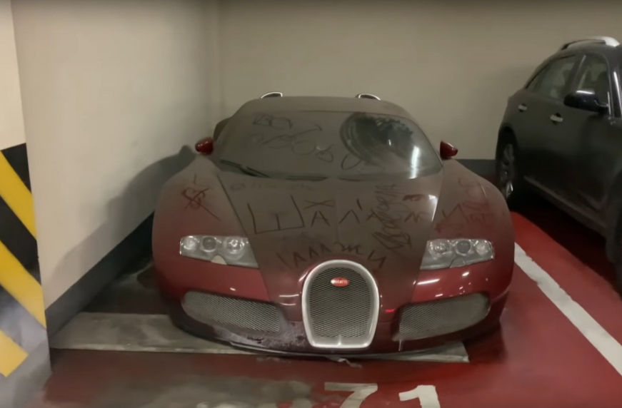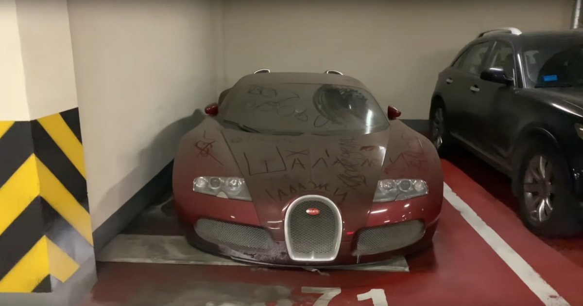 Причому йдеться не про “якийсь” Мерседес або БМВ, а про гіперкар Bugatti Veyron. Як видно з опублікованого відео нижче, товстий шар пилу і “розмальовки” на його кузові вказують на те, що автомобіль стоїть недоторканим досить довго.