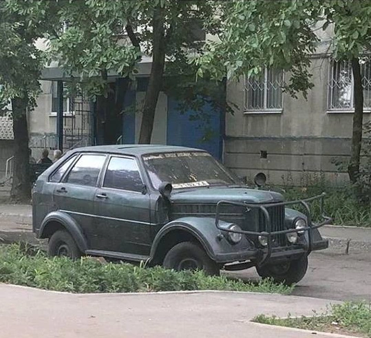 Что это за автомобиль, неясно - можно лишь говорить о том, что перед нами а-ля внедорожник. У машины перед позаимствован у ГАЗ-69, а большая часть кузова - у старой Ауди (вроде как). Также самодельный вездеход оснастили массивным кенгурятником.