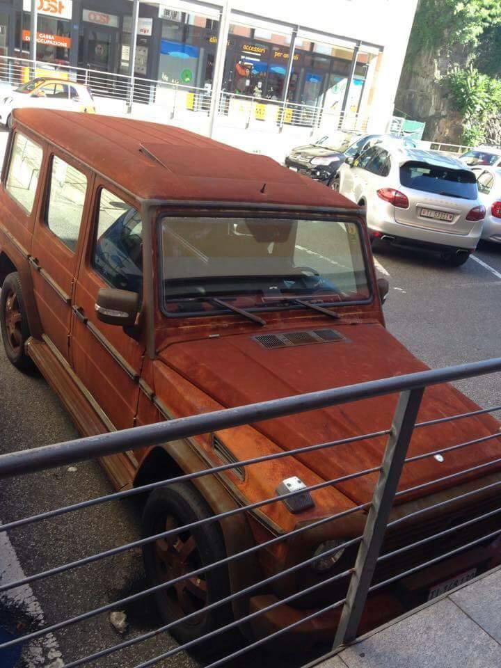 За границей пленкой под ржавчину оклеивают даже новые Порше и другие суперкары. Что касается ржавого Гелендвагена, как видно по номерам, его владелец проживает в Швейцарии. Вне сомнений, на живописных дорогах этой богатой страны такой автомобиль привлекает куда больше внимания, чем “пресловутые” для здешних краев Bentley и Ferrari.