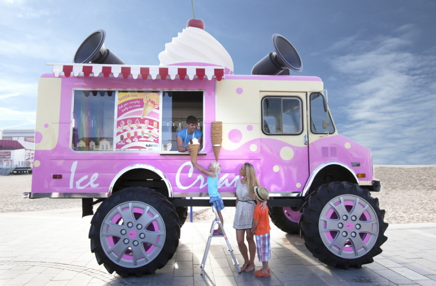 К презентации нового поколения версии Skoda vRS в компании создали самый большой в мире фургон для мороженого. Особым восторгом фургон пользуется у детишек, которые могут совершенно бесплатно полакомиться мороженым. Машина весом 5,5 тонн построена на платформе биг-фута и снабжена 4-мя громкоговорителями. На его постройку ушло три недели непрерывного труда инженеров компании. Создатели пообещали за время участия машины в промо-акциях Octavia vRS накормить мороженым более 6,5 тысяч посетителей.