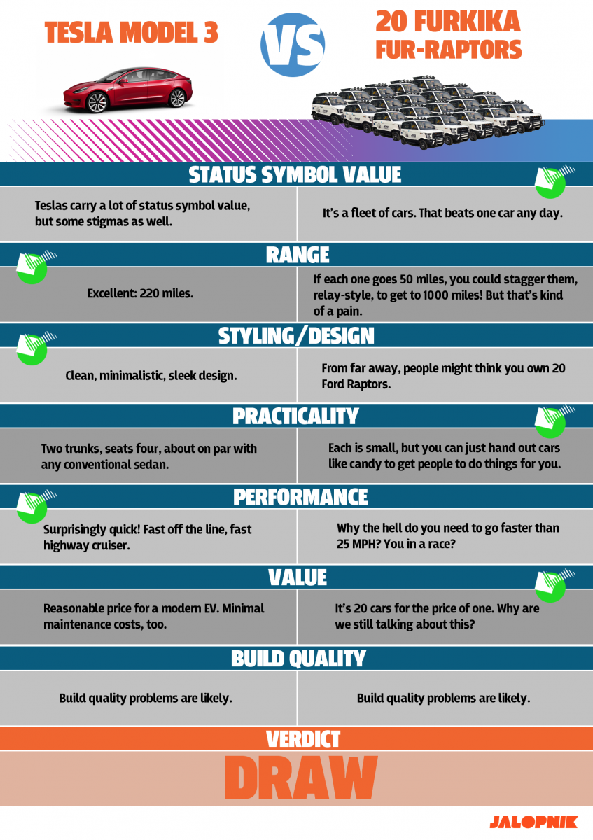 При этом журналисты посчитали, что 20 электрокаров более практичны, чем одна 4-местная Тесла с двумя багажниками. Учитывая, что максимальная скорость китайских электрокаров не превышает 40 км/ч, пункт динамики естественно за Теслой. А вот пункт стоимость однозначно за Фуркикой – 20 штук по цене одной, о чем тут разговаривать? Качество сборки у оппонентов примерно одинаковое, потому в последнем решающем пункте паритет.