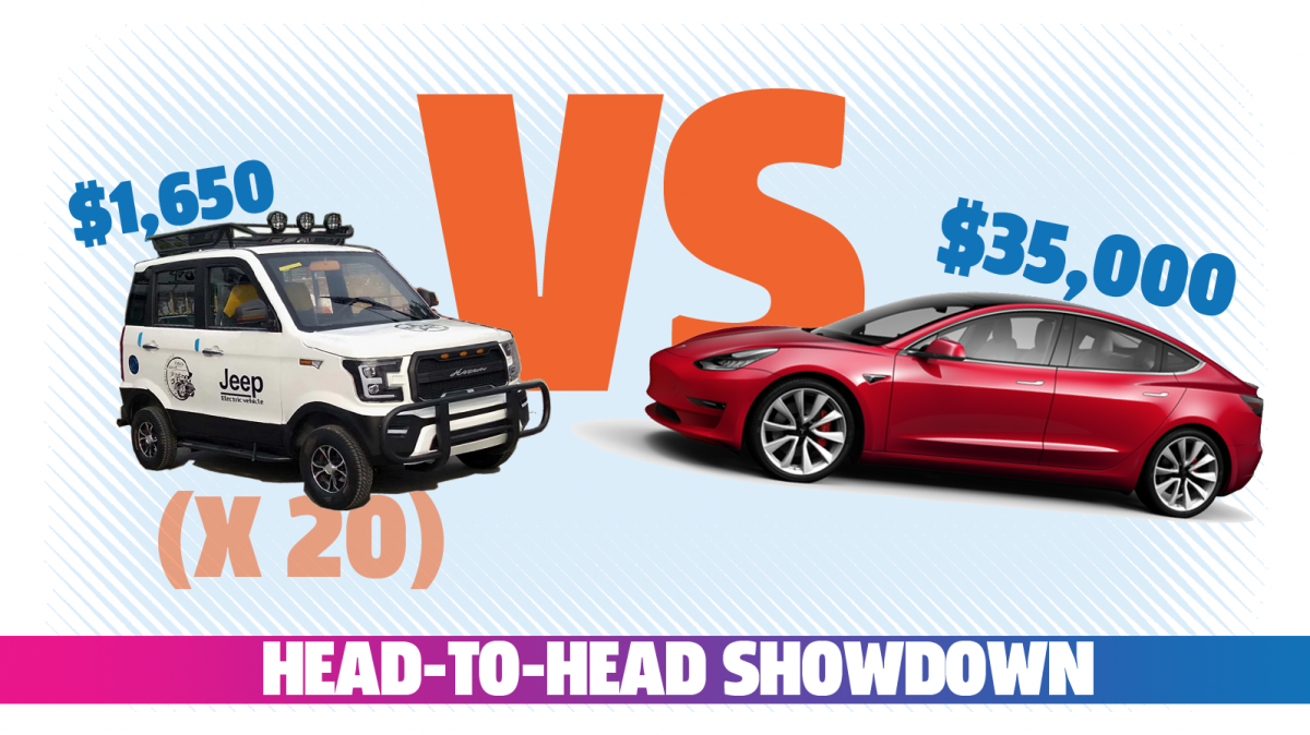 Журналисты издания Jalopnik решили сравнить популярный электрокар Tesla Model 3, который в «базе» стоит 35 000 дол., с двумя десятками китайских электромобилей Furkika Fur-RAPTORs по цене всего $1 650 за штуку.