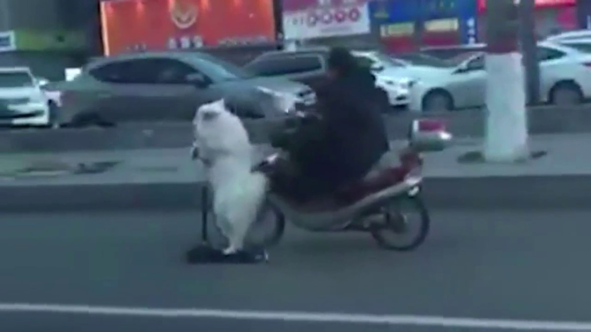 Shaggy друг їздить зі своїм господарем по магазинах і навіть на роботу. Як транспортний засіб для чотириногого друга використовується електричний самокат, на якому він тримається доволі впевнено.