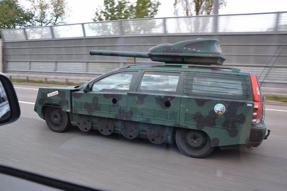 Понятно, что модернизация поставила крест на аэродинамике, а добавленный вес негативно сказался на управляемости. Тем не менее, владелец постарался хорошо: танк на базе Volvo V70 - это очень символично.