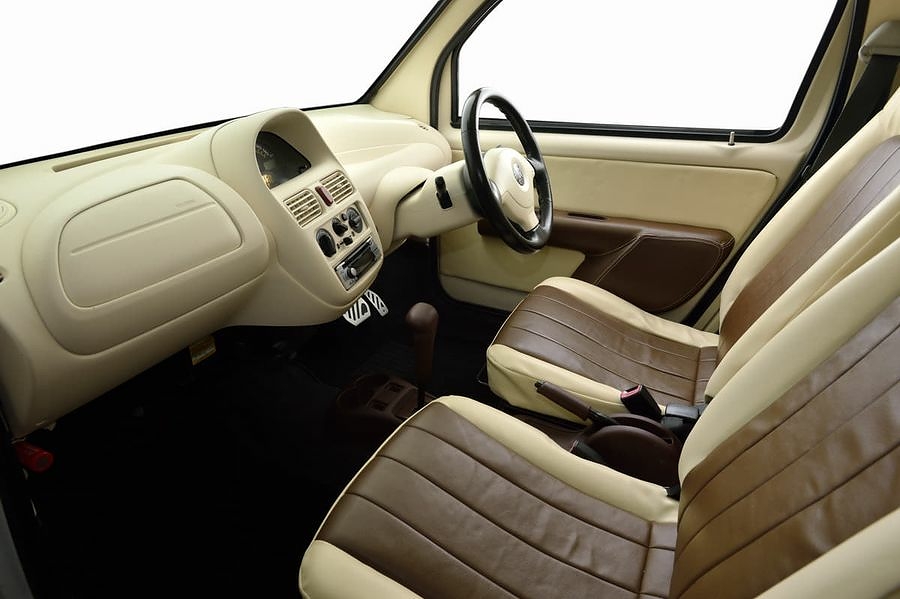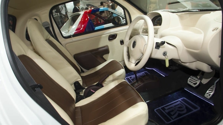 Для переробки інтер’єру студенти зважилися на невелику хитрість і просто перефарбували всі пластикові панелі в кремовий колір. На жаль, виконати те саме із сидіннями не вийшло. Їх довелося обшити натуральною кремовою шкірою.