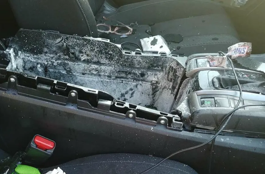 Однак навколо було розкидано багато скла, що наштовхнуло на думки про вибух зсередини. Власне, так і сталося. Річ у тім, що в боксі під підлокітником лежав газовий балончик з сухим шампунем. Так, він вибухнув. А те, що від нього залишилося, приземлилося за 15 м від машини.