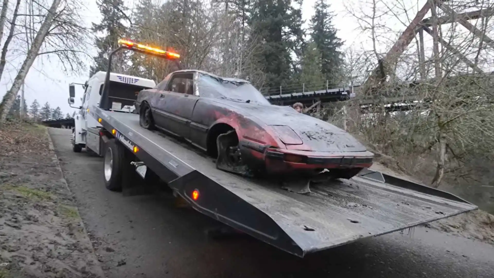 Але на дні річки виявилося куди більше приємних знахідок. Першим "уловом " стала червона Mazda RX-7. Автомобіль має катастрофічний вигляд. У нього сильно пошкоджений дах. До того ж, один з аквалангістів зняв шильдик з кузова, щоб роздивитися який це автомобіль. Незважаючи на це, дайвери сподіваються, що RX-7 все-таки вдасться відновити.