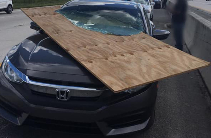 Посмотрите на фото: ветровое стекло буквально разрезано плохо закрепленным листом фанеры, которая во время движения грузовика выпала из кузова и угодила прямо в Honda Civic. Передние стойки не позволили фанере продолжить движение. При столкновении деревяшки с автомобилем под другим углом, все могло закончиться очень плохо.
