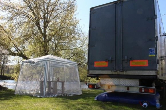 Конечно, жизнь в прицепе сулит определенные нюансы. Так, например, располагаться нужно поближе к водоему, чтобы при помощи насоса закачивать из него воду в дом. Кстати, она проходит три степени очистки, но для питья все равно не пригодна – только как техническая. Санузел и мойка на кухне соединены с гибкой канализационной емкостью 2000 л, которую в раз месяц-полтора нужно очищать.