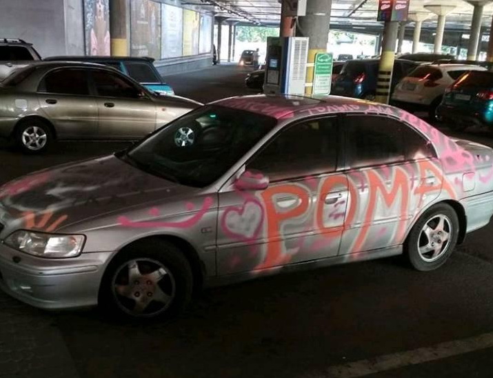 Как можно видеть на фото, сделанному в городе Харьков, серебристому седану досталось изрядно – разукрашенным в различные фигуры, сердечки и надписи оказался весь кузов. Более того, частично были задеты окна.