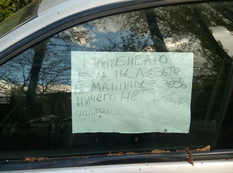 Нерозмитнений Ягуар вже не перший день «поростає мохом» в одному з київських дворів неподалік від Караваєвих дач. Судячи із записки (а з неї, як і з пісні, слів не викинеш), власника машини дуже розлючує, що хтось постійно намагається залізти у неї…