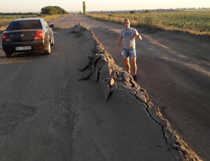 В комментариях к фото называют это образование отбойником и даже столкновением тектонических плит. В любом случае, теперь трасса Бобринец-Николаев претендует на звание самой разбитой в Украине.