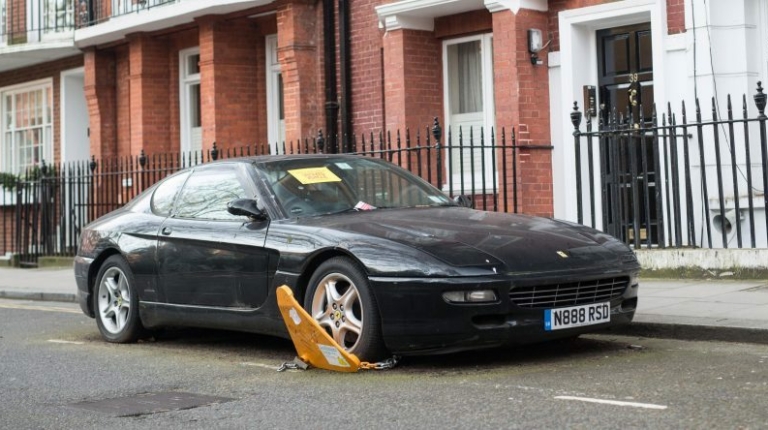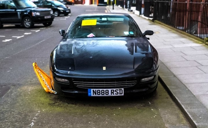 В одном из центральных районов Лондона обнаружена интересная находка. На одной из улиц там уже два года припарковано старое купе Ferrari 456. За это время автомобиль ни разу не сдвинулся с места, а его владелец задолжал за парковку. Неудивительно, что недавно на переднем колесе Феррари появился блокиратор.