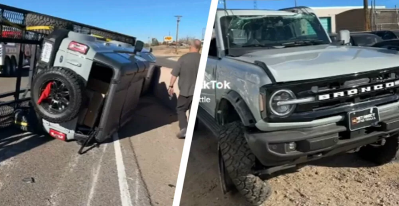 Справа в тому, що водій автовоза не впорався з керуванням і перекинувся на бік, прихопивши Bronco із собою. Від удару автомобіль отримав низку серйозних пошкоджень. У нього погнутий капот, крило та двері з пасажирського боку, пошкоджено дах, розбито вітрове та бічне скло, а також деформована вісь.