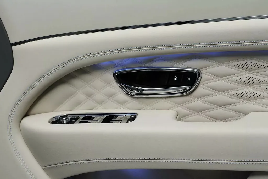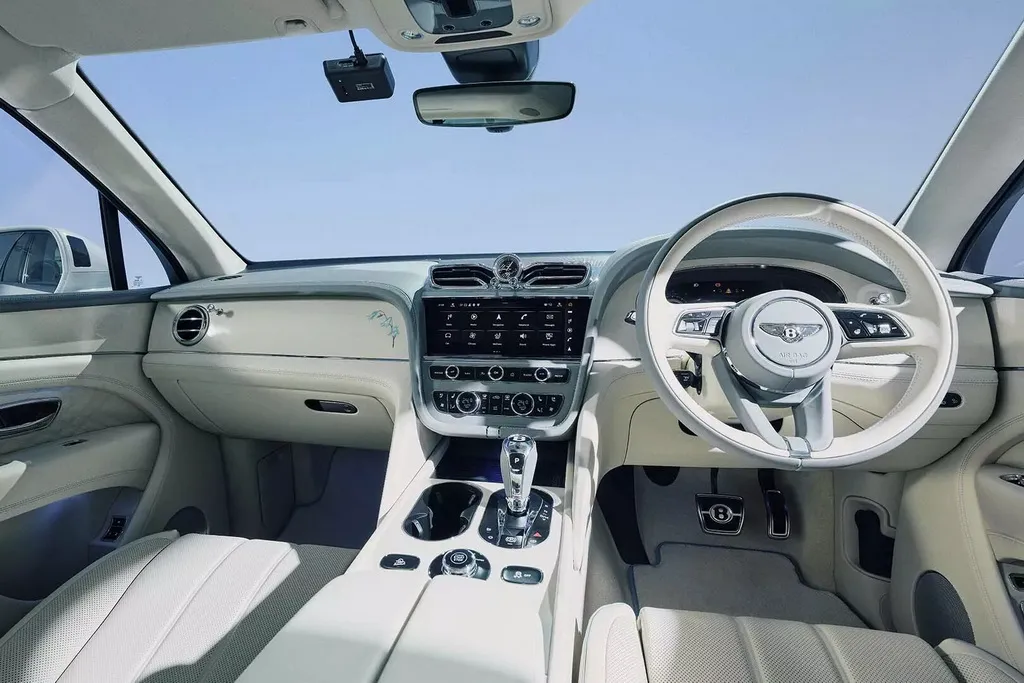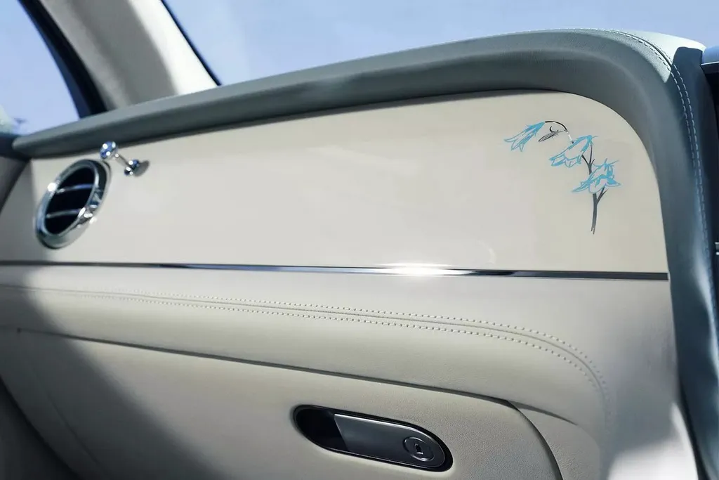 В інтер’єрі додано кілька синіх акцентів, включаючи вишиті на спинках сидінь значки Bentley та сині квіткові мотиви на панелі приладів.