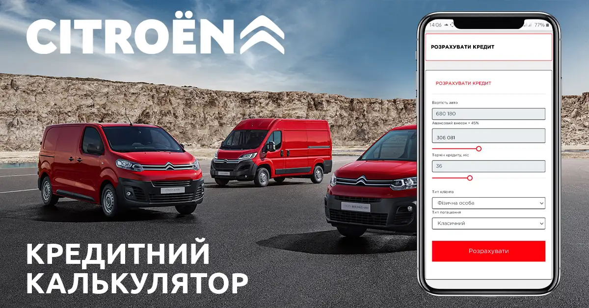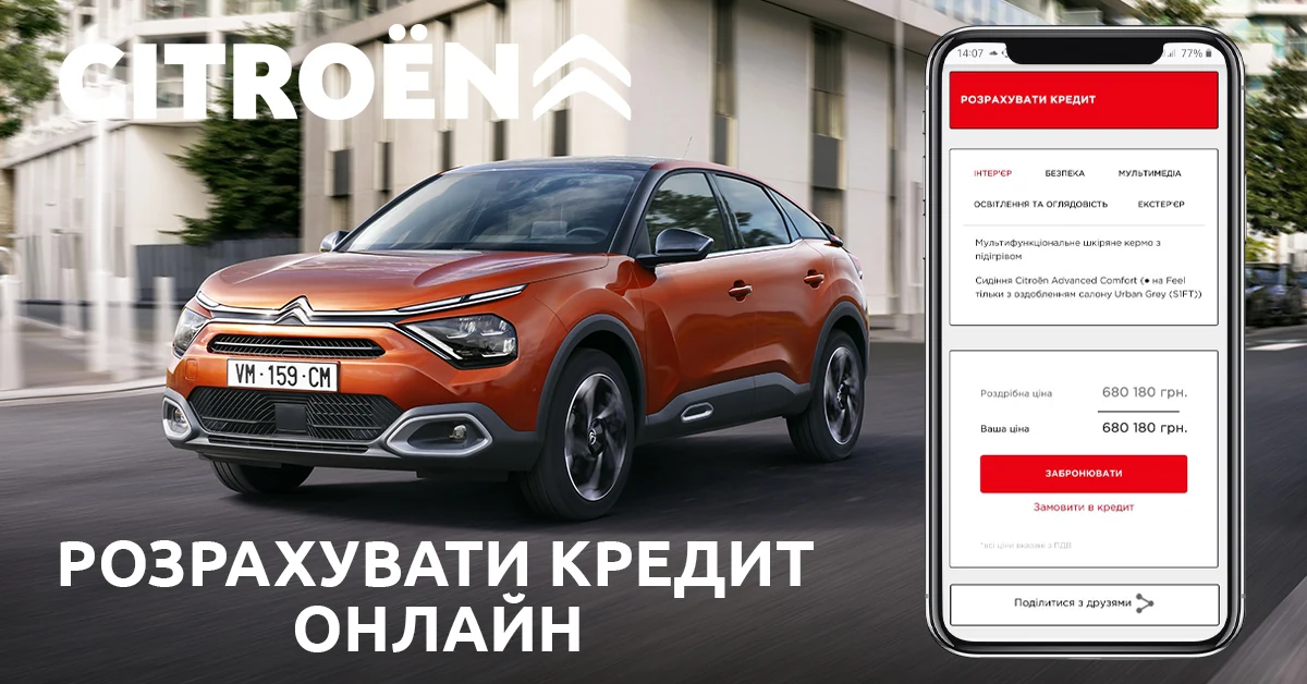 Фірмовий підхід "Ваш комфорт - наш пріоритет" для Бренду CITROЁN завжди був ключовим. І це проявляється не тільки в автомобілях CITROЁN, але також у супутніх послугах Бренду: сервіс та гарантія, фіксована вартість ТО, програма допомоги у дорозі CITROЁN Assistance, конфігуратор та онлайн-склад автомобілів. Кожна послуга, кожен напрямок продумано і створено для того, щоб зробити життя власника автомобіля CITROЁN більш комфортним, простим, зручним. І тепер Бренд запускає нову функцію у фірмовому онлайн-магазині CITROЁN – розрахунок кредиту на автомобіль у режимі «реального часу»!