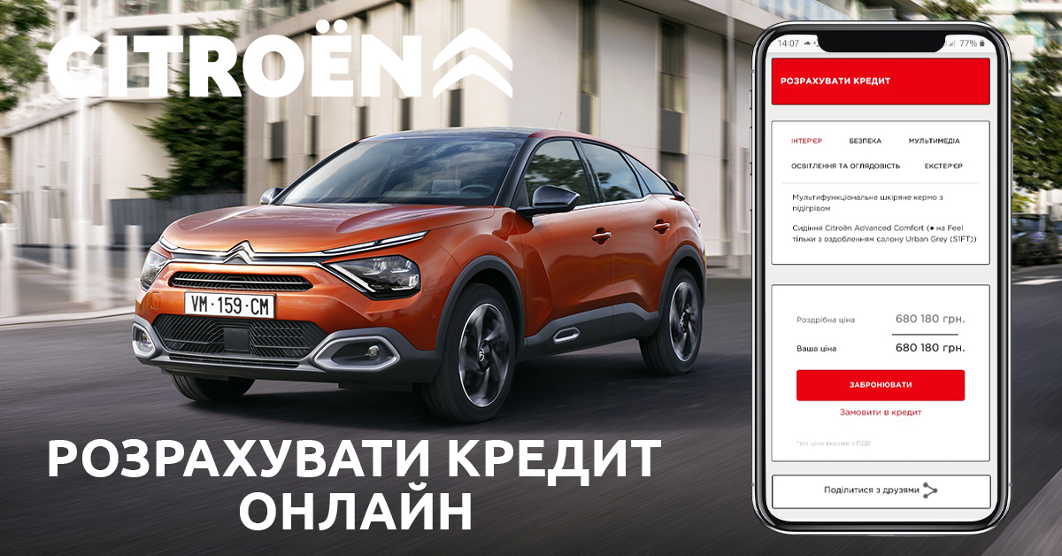 Фірмовий підхід “Ваш комфорт – наш пріоритет” для Бренду CITROЁN завжди був ключовим. І це проявляється не тільки в автомобілях CITROЁN, але також у супутніх послугах Бренду: сервіс та гарантія, фіксована вартість ТО, програма допомоги у дорозі CITROЁN Assistance, конфігуратор та онлайн-склад автомобілів. Кожна послуга, кожен напрямок продумано і створено для того, щоб зробити життя власника автомобіля CITROЁN більш комфортним, простим, зручним. І тепер Бренд запускає нову функцію у фірмовому онлайн-магазині CITROЁN – розрахунок кредиту на автомобіль у режимі «реального часу»!