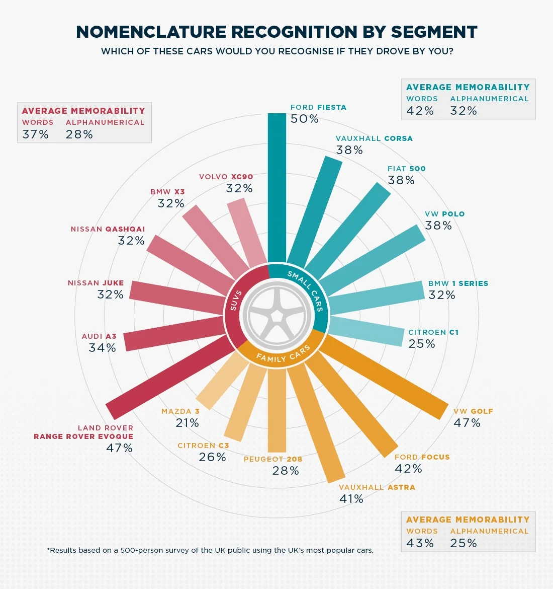 Британська лізингова компанія Vanarama з'ясувала, які назви автомобілів краще і простіше запам'ятовуються. У дослідженні взяли участь 500 респондентів. Як виявилося, найпростіше запам'ятовуються літерні назви, на другому місці — буквено-цифрові індекси.