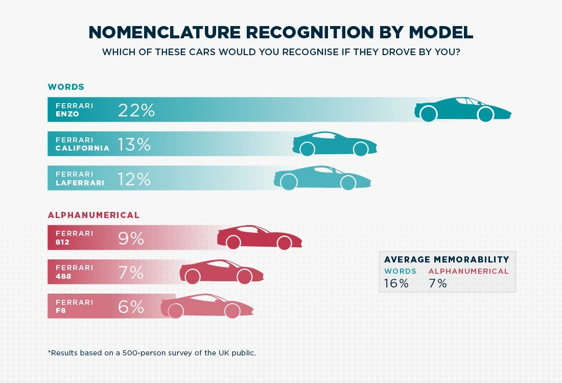 Якщо говорити про моделі всередині бренду, то найбільш запам'ятовуються автомобілі від Феррарі, а саме Enzo, LaFerrari і California. Назви моделей, що складаються з цифр і літер, такі як 812, 488 і F8 виявилися наприкінці довгого списку.