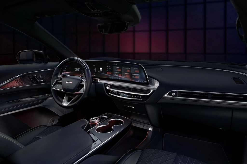 У салоні з'явилися нове спортивне кермо з логотипом V, алюмінієвий джойстик керування трансмісією, нові крісла та особливе оздоблення з фірмовим декором. Вся інформація виводиться на великий 33-дюймовий дисплей з новою графікою та розширеним функціоналом. Також модель стала першим Cadillac, який отримав подвійний проєкційний екран доповненої реальності. Крім того, в активі новинки великий панорамний скляний дах, автопілот Super Cruise і преміальна аудіосистема AKG з 23-ма динаміками.