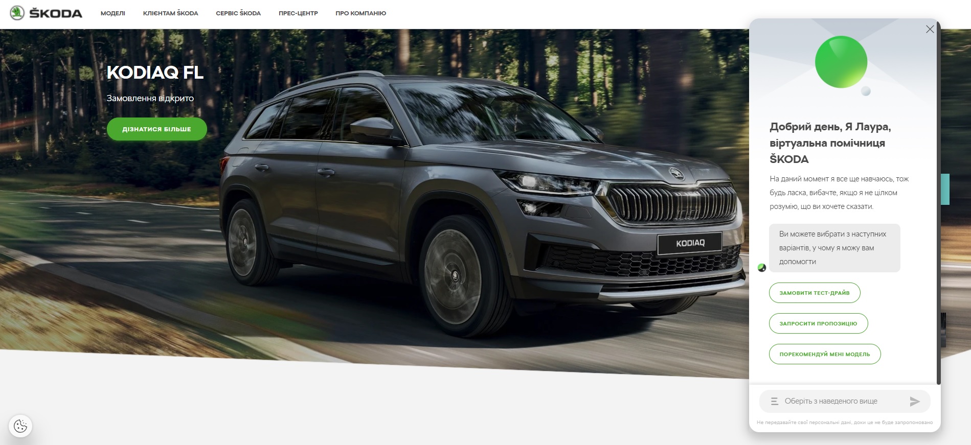 Наприкінці 2020 року компанія «Єврокар», офіційний дистриб’ютор ŠKODA AUTO в Україні, запустила на своєму сайті віртуального помічника – чат-бот Лаура. Півроку потому система все ще удосконалюється, але вже зараз, окрім запису на тест-драйв і запиту пропозиції від дилера, Лаура може підібрати для клієнта найвідповіднішу модель автомобіля ŠKODA, враховуючи його пріоритети і побажання.