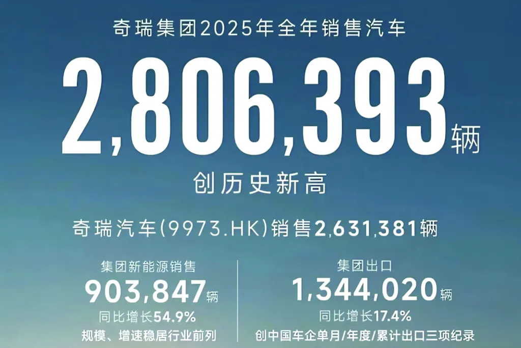 Загальний обсяг продажів Chery Group минулого року становив 2 806 393 млн автомобілів (+7,8%), включаючи 1 344 020 млн автомобілів, відправлених на експорт (+17,4%), та 903 847 автомобілів на нових джерелах енергії (+54,9%). Річний обсяг експорту також становив 47,9% від загального обсягу річних продажів.