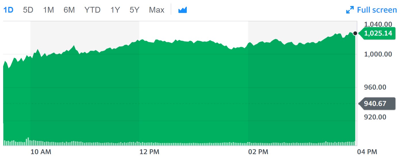 Скучили за хорошими новинами про Tesla? Вартість акцій компанії перевищила $1000 за штуку. Вчора, 10 червня, ціна збільшилася до рекордних $1017. Сьогодні — вже $1025. Ймовірно, коли ви перевірите котирування за посиланням, цифри можуть виявитися ще вищими.