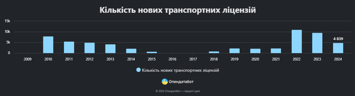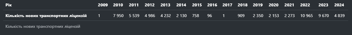 За вісім місяців цього року було видано 4800 транспортних ліцензій. Це вдвічі більше ніж за весь 2021 рік (тоді видали 2200 дозволів). Найбільше транспортних ліцензій було видано у 2022 році — 10 900 штук.