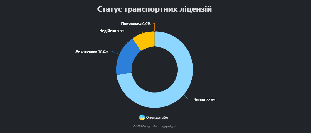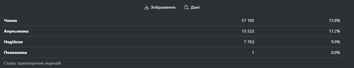 На середину серпня цього року в Україні видано 78 тисяч транспортних ліцензій. З них 27,2% є недійсними чи анульованими. Відновлено – лише одну.