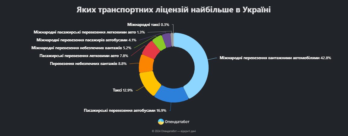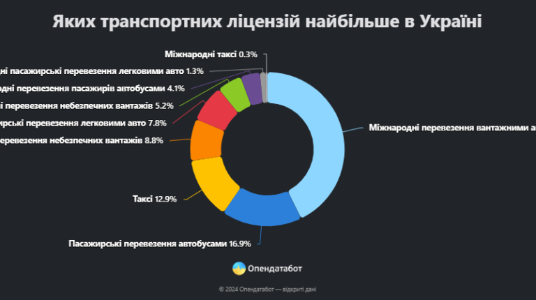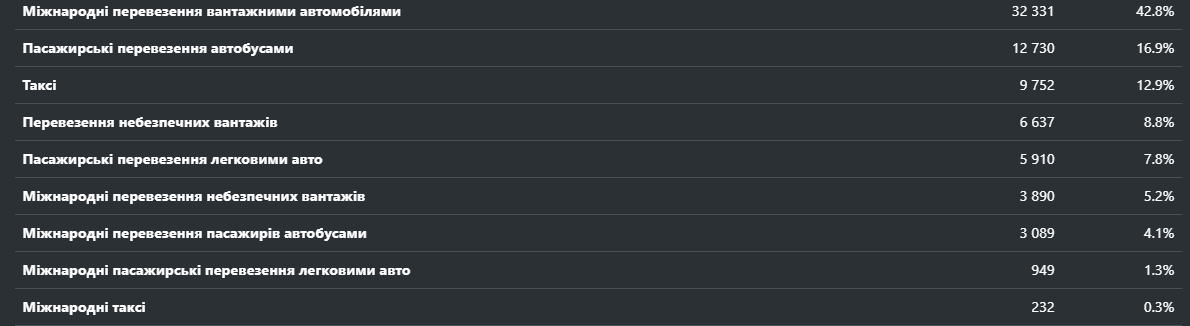 Про це повідомив Опендатабот, посилаючись на дані Укртрансбезпеки. Зазначається, що найбільше ліцензій було видано у 2022 році. Дійсними із загальної кількості є 57 тисяч ліцензій, що становить 72,8%. Якщо розглядати кількість реєстрацій із позиції категорій, то найбільше було зареєстровано у «Міжнародні перевезення вантажів вантажними авто» – 32 000 ліцензій, що становить 42,8%. Друге та третє місце у цьому рейтингу посідають «Внутрішні перевезення пасажирів автобусами» та «Таксі», на які припало 12 000 (16,9%) та 9 000 (12,9%) відповідно.