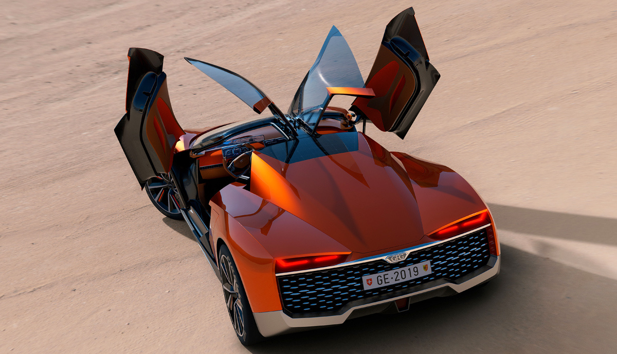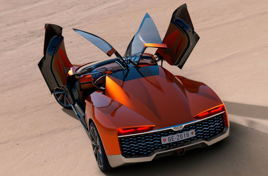 А ось відомий автомобільний дизайнер Джорджетто Джуджаріо і його син Фабриціо привезли на швейцарське автошоу повністю електричний кросовер у вигляді спорткара (HYPER-SUV) з неймовірними задніми поворотниками.