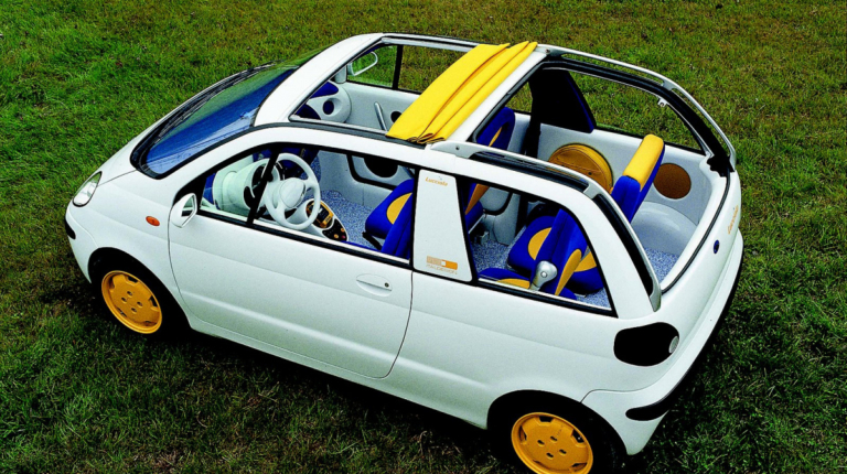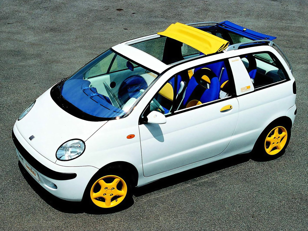 Сегодня при виде этого концепт-кара, многие подумают, что это тюнинговая переделка Daewoo Matiz. Оказывается, все с точностью да наоборот. В 1993 году итальянское дизайнерское ателье ItalDesign представило перспективную разработку небольшого автомобиля для молодежи – Lucciola. Он привлекал внимание игривой внешностью с лупатыми фарами, тентованной крышей и ярким окрасом.