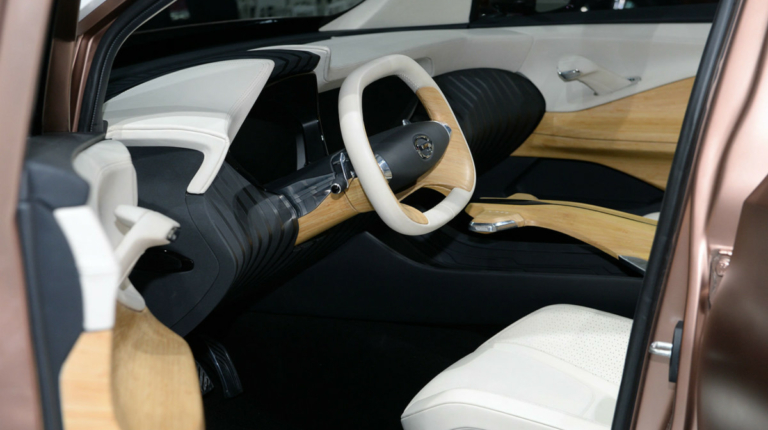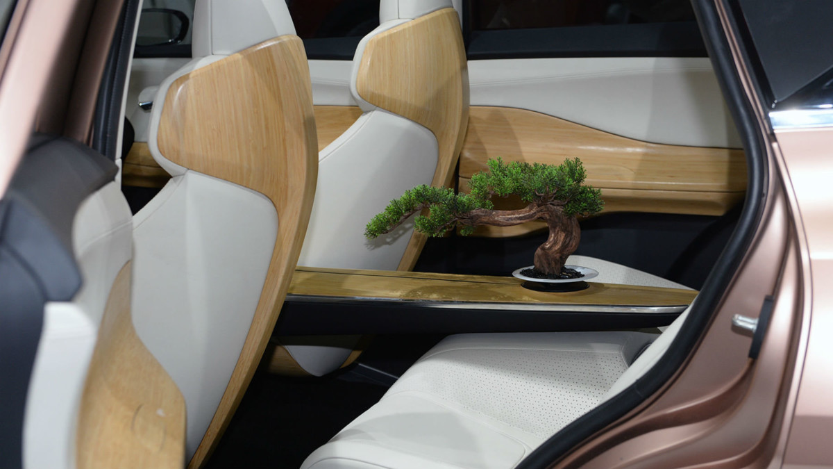 Как заявляет производитель, в отделке салона применены натуральные материалы, а сам интерьер сделан по фэн-шуй. Изюминка кроссовера – карликовое живое дерево, размещенное в подлокотнике между задними пассажирами.