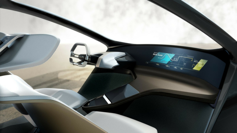 Салон BMW i Inside Future має вельми лаконічний вигляд без надмірностей. Величезний рідкокристалічний екран розтягнутий майже на всю ширину передньої панелі. На нього виведено показання приладів, дані навігації та індикатори роботи автопілота.