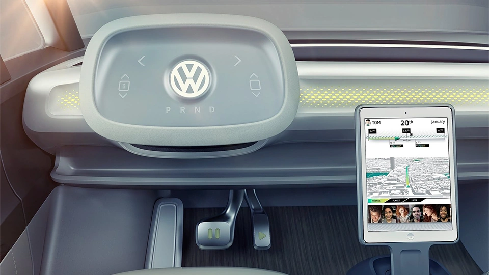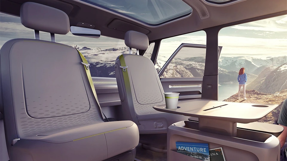 Салон Volkswagen I. D. Buzz розрахований на 8 осіб, багажників у машини два – спереду і ззаду. З увімкненим автопілотом кермо можна скласти в передню панель, а передні сидіння розвернути проти ходу руху – обличчям до другого ряду, який, у свою чергу, можна трансформувати в столики. Третій ряд крісел є можливість перетворити у ліжко.