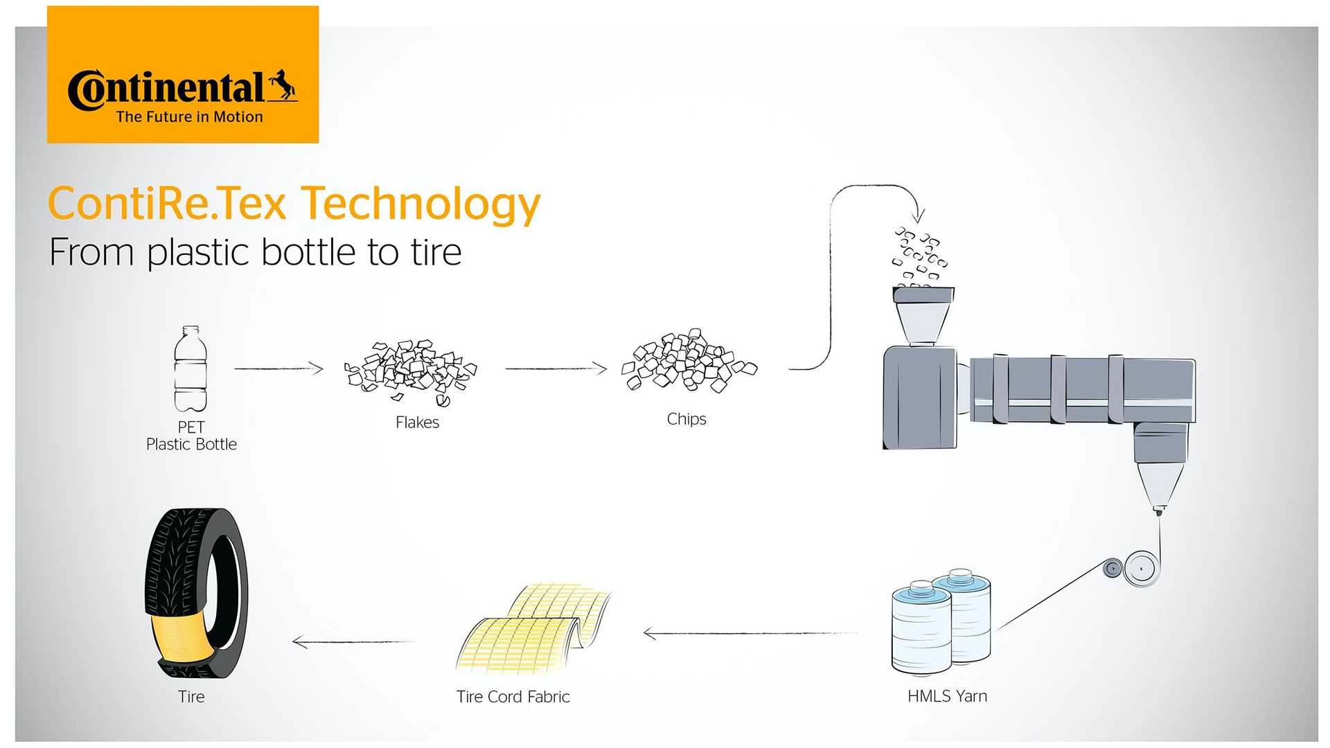Із пластикових пляшок компанія планує виготовляти поліефірну пряжу для каркасів шин. Таку пряжу Continental вже використовує у окремих типах шин. Залежно від розміру пляшки на одну шину йде від 9 до 15 пляшок. Як і у випадку із рисовим лушпинням, використання пляшок є більш енергоефективною альтернативою виготовлення необхідного для виробництва шин поліестеру. Також у якості сировини використовують старі шини. Але, як кажуть у компанії, їхній поділ на гуму, залізо та корд «дуже складний процес».