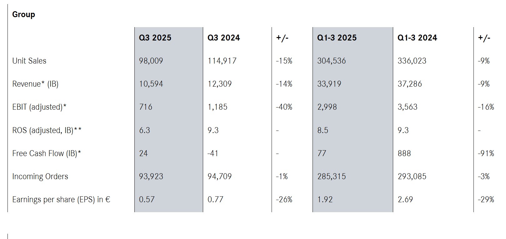 За загального обсягу продажів Групи у 3 кварталі 2025 року у розмірі 98 009 одиниць (3 квартал 2024 року: 114 917), виручка в промисловому бізнесі була на 10,6 млрд євро нижчою, ніж у третьому кварталі попереднього року (3 квартал 2024 року): 12,3 млрд євро. Скоригована EBIT Група за звітний період склала 716 млн євро (3 квартал 2024 року: 1,18 млрд євро), скоригована рентабельність продажів у промисловому бізнесі склала 6,3% (3 квартал 2024 року: 9,3%). Вільний грошовий потік (FCF) ІБ становив 24 млн євро (3 квартал 2024 року: мінус 41 млн євро). Прибуток на акцію (EPS) у 3 кварталі становив 0,57 євро (3 квартал 2024 року: 0,77 євро).