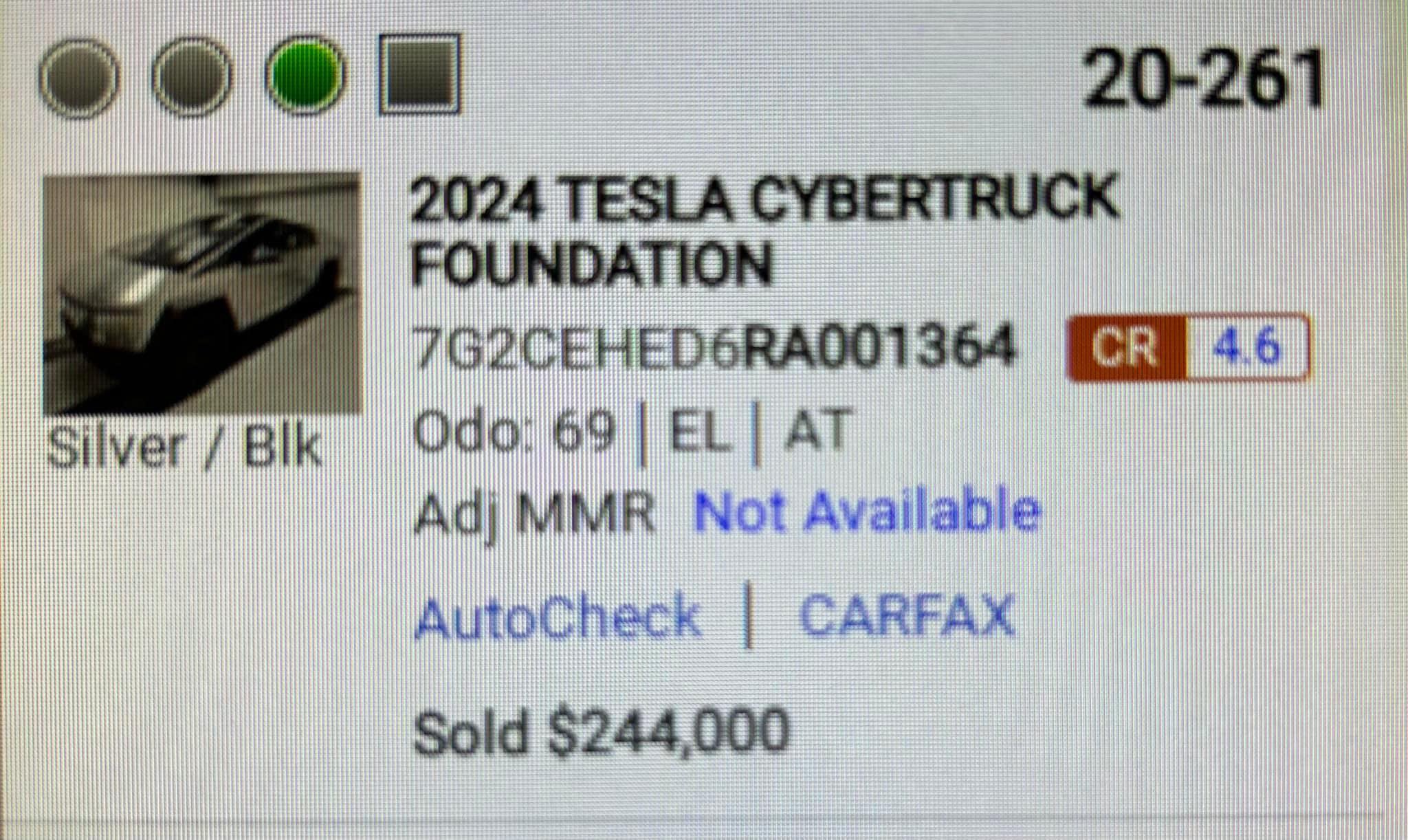 На одному з майданчиків, зокрема Cox Automotive в Манхеймі, нещодавно продали новенький Tesla Cybertruck. Виручили за пікап 244 000 доларів, що майже вдвічі дорожче за рекомендовану роздрібну ціну. Наразі це рекордний показник. Раніше електричні пікапи американської марки вже йшли з молотка, але надприбутки були не настільки колосальним.