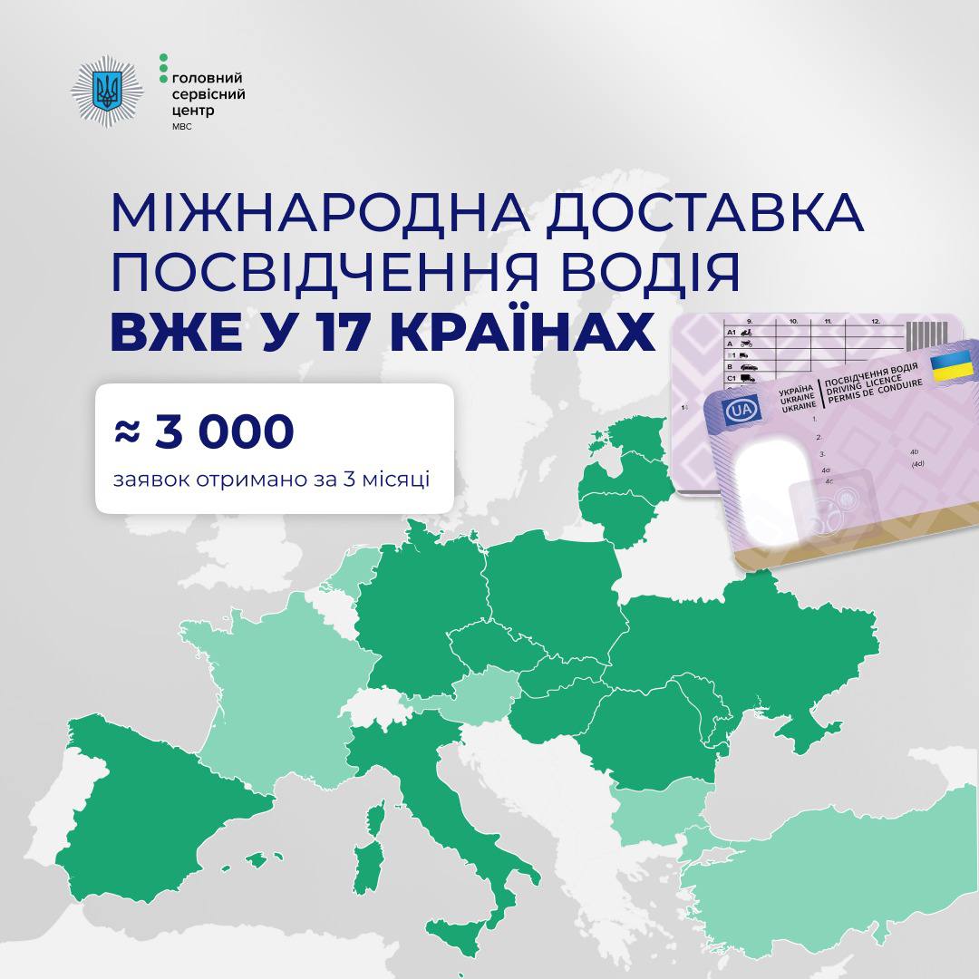 З 19 січня українці можуть замовити доставку посвідчення водія ще в п’ять країн: Болгарію, Францію, Нідерланди, Туреччину та Австрію. Раніше міжнародну доставку запустили до Польщі, Німеччини, Угорщини, Молдови, Словаччини, Румунії, Іспанії, Литви, Латвії, Естонії, Чехії та Італії.