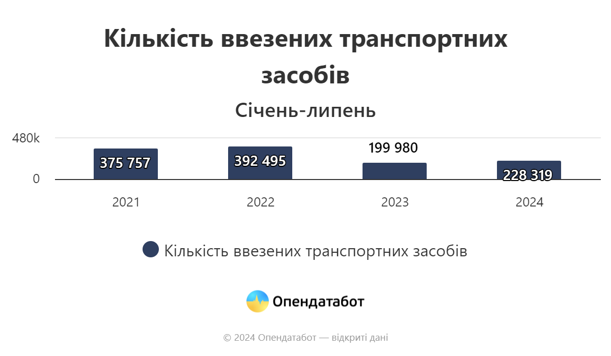 Більш як 228 тисяч авто ввезли в Україну за 7 місяців 2024 року за даними Міністерства внутрішніх справ. Понад дві третини з них були вживаними. Такі дані опублікував сервіс відкритих даних Опендатабот.