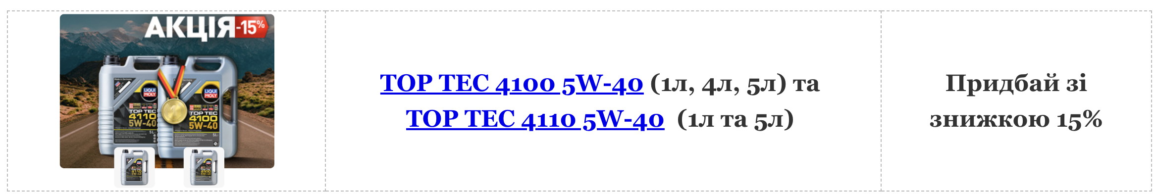 З 18 серпня по 21 вересня 2025 року діє спеціальна акція «Найпопулярніша олива 5W-40 від LIQUI MOLY» зі знижкою 15% на обидві оливи — Top Tec 4100 5W-40 і Top Tec 4110 5W-40 у всіх фасуваннях до 5 літрів. Це чудова нагода зробити вибір на користь перевіреної якості та водночас заощадити.