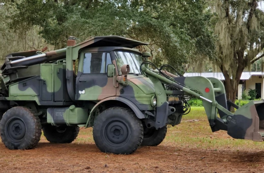 Ще один цікавий екземпляр — військова інженерна машина Freightliner Unimog зі знімним фронтальним навантажувачем із гідравлічним приводом. Автомобіль використовувався армією США й досі пофарбований у камуфляж.