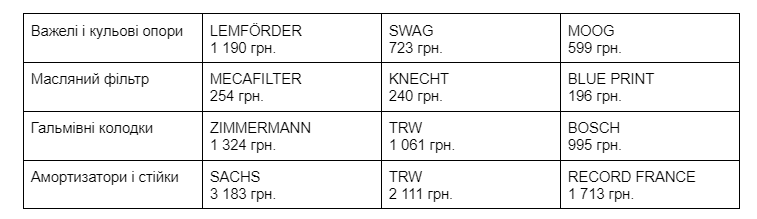 На прикладі популярного серед українців авто Skoda Octavia Tour розглянемо цінову політику різних брендів залежно від “преміальності” їх деталей (за даними сайту https://avtoto.com.ua/ на 06.02.2024):
