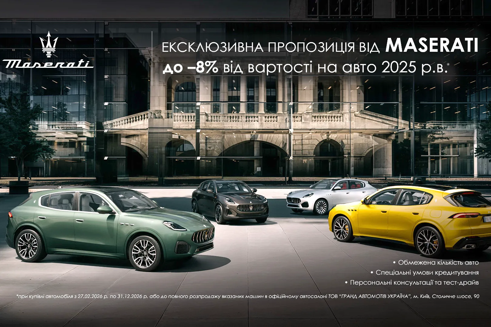 Кількість автомобілів у межах пропозиції обмежена, а умови діють з 27 лютого 2026 року до 31 грудня 2026 року або до повного розпродажу вказаних машин в дилерській мережі ТОВ «Гранд Автомотів Україна». Детальну інформацію щодо доступних комплектацій, умов придбання та персональних консультацій можна отримати в офіційного дилера Maserati в Україні.