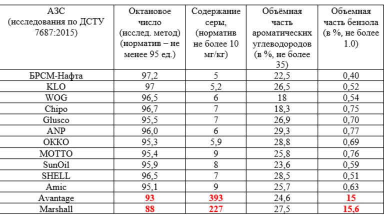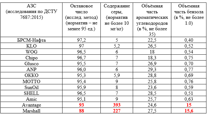 Пробы были отправлены в сертифицированную лабораторию, где их исследовали на соответствие нормативам профильного ДСТУ 7687:2015 (бензин А-95-Евро5). Образцы были проверены по основным параметрам – октановое число, содержание серы и объемные части ароматических углеводородов и бензола. Результаты не порадовали – три образца оказались не кондиционными.