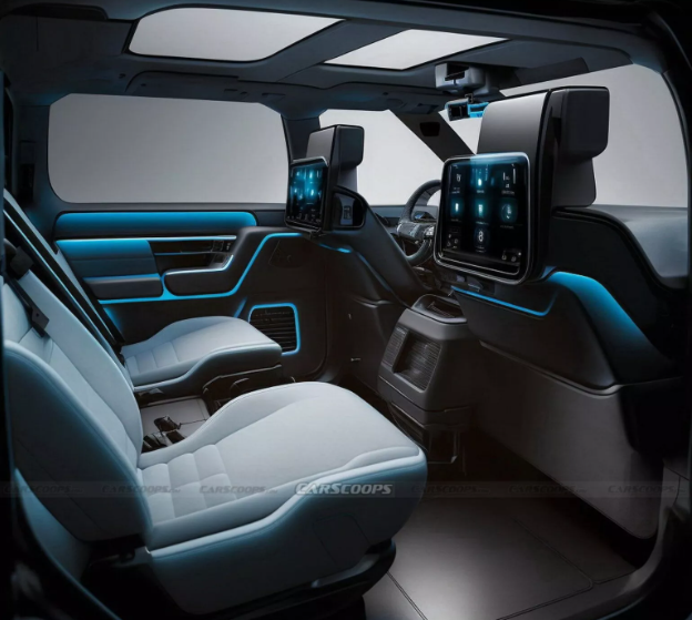 В екстер’єр електричного позашляховика переважають рубані грані та ефектні виштампування. Ще можна відзначити вузьку світлодіодну оптику, масивні бампери, широку лінію скла та великі колеса. Доповнюють брутальний образ обважування з темного пластику та рейлінги на даху.