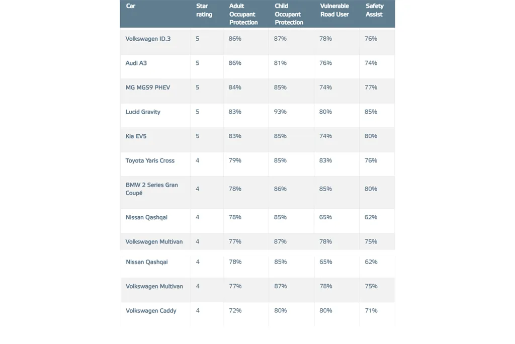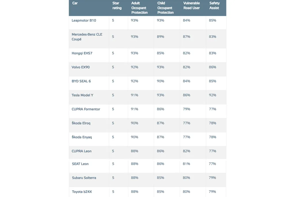 Вибір включає широкий спектр автомобілів – від електричних позашляховиків і розкішних купе до компактних кросоверів і великих сімейних автомобілів. 18 випробуваних моделей отримали максимальний п’ятизірковий рейтинг Euro NCAP за визначні показники безпеки.