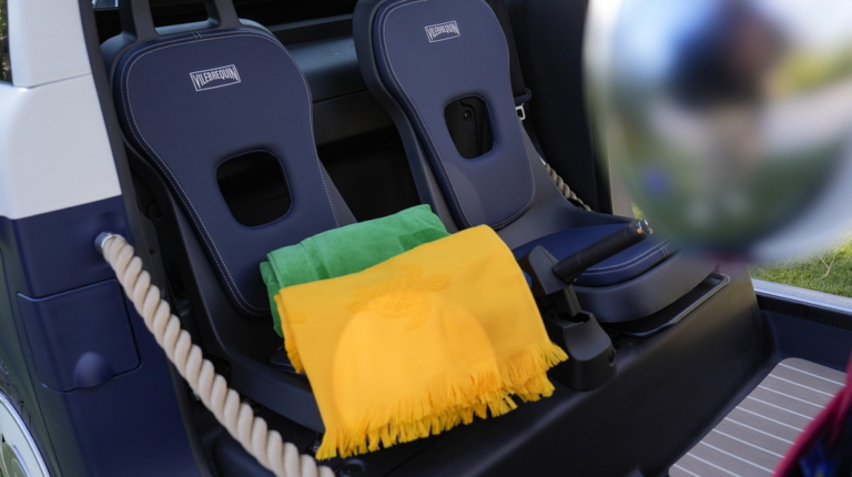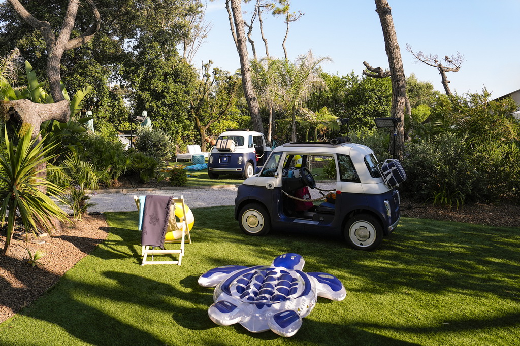 Двоколірна біло-синя ліврея викликає асоціації з геометрією смугастих парасольок, вітрильних навісів та ретро-купальниками. М’який верх відкидається назад, як капелюх від сонця. Ззаду передбачено кріплення для багажної сумки або набору для пікніка, а вбудований душ дозволить змити пісок перед поверненням додому з пляжу.