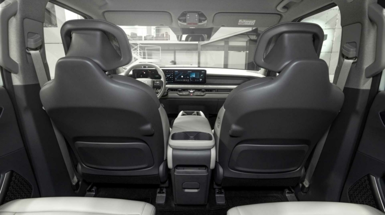 Ще можна відзначити «ширяючий» дах, затемнені стійки, висувні дверні ручки, широкі колісні арки з пластиковими темними накладками і аеродинамічні диски з оригінальним дизайном. На кормі видно великий спойлер та масивну захисну пластину на бампері. Загальна довжина EV9 досягає 4,9 м за колісної бази 3 м.